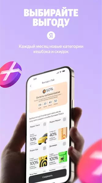 Выбирайте любимые категории выгоды и получайте повышенный кешбэк, скидки и другие бонусы. А за открытие карты Пэй может быть доступна возможность получить до 2 месяцев подписки Яндекс Плюс в подарок.