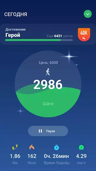 Для экономии заряда подсчет шагов можно в любой момент ставить на паузу и возобновлять. На паузе приложение не будет обновлять статистику в фоновом режиме. А если захотите, можно сбросить шаги за день и начать считать с нуля.