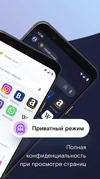 Opera Mini надежно защищает конфиденциальность. Используйте приватные вкладки для анонимного просмотра веб-страниц: в них действия не отслеживаются, а на устройстве не остается следов от посещения.