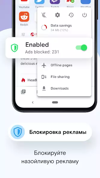 В браузер встроены блокировщик рекламы и диспетчер загрузки, позволяющий обмениваться файлами офлайн. Медиаплеер поддерживает управление одной рукой, что удобно для мобильных устройств. А искусственный интеллект отбирает новости специально для вас.