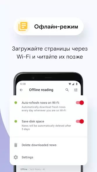 Сохраняйте новости и веб-страницы, когда подключены к Wi-Fi, а затем читайте офлайн, не расходуя трафик. Легко управляйте сохраненными файлами: чтобы быстро находить их, добавьте ярлык в раздел чтения офлайн на панели навигации.