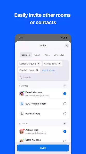 ● Общайтесь с кем угодно, использующим Zoom Rooms, Android, iOS, Windows, Mac, конференц-системы SIP / H.323, телефоны и другие устройства.