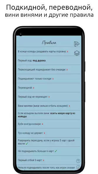 Настраиваемые правила - в каждой компании принято играть в Дурака немного по своим правилам. Мы реализовали в игре многие распространенные правила: погоны, вини винями, первый ход из-под или под дурака, подкидывать только 6 карт или больше и многие другие.