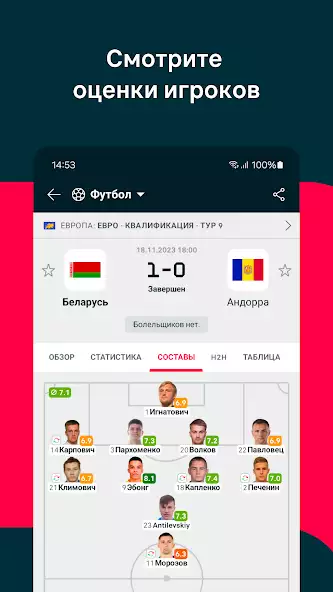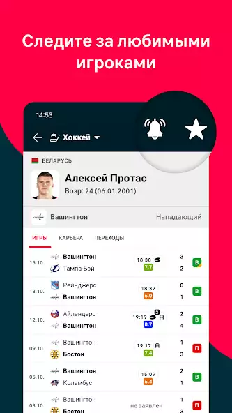 🔔 Подпишитесь на любимых игроков: добавьте их в свой список и разрешите получать уведомления, чтобы никогда не пропустить их появление в стартовом составе, голы, карточки или рейтинги.