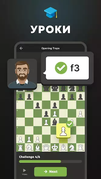 – Играйте партии с тренером, который будет шаг за шагом обучать вас шахматным основам и давать полезные советы во время игры.